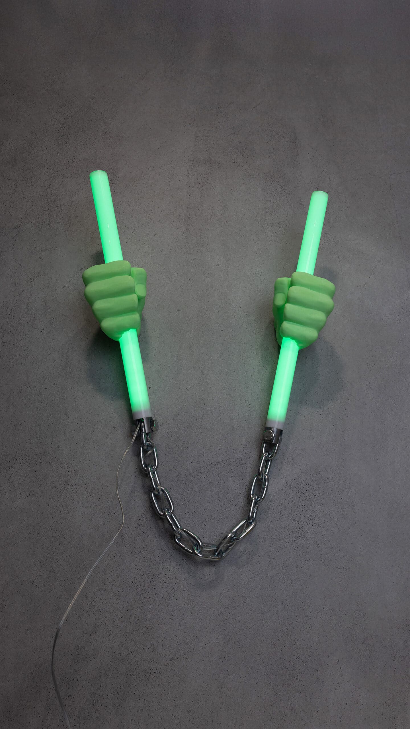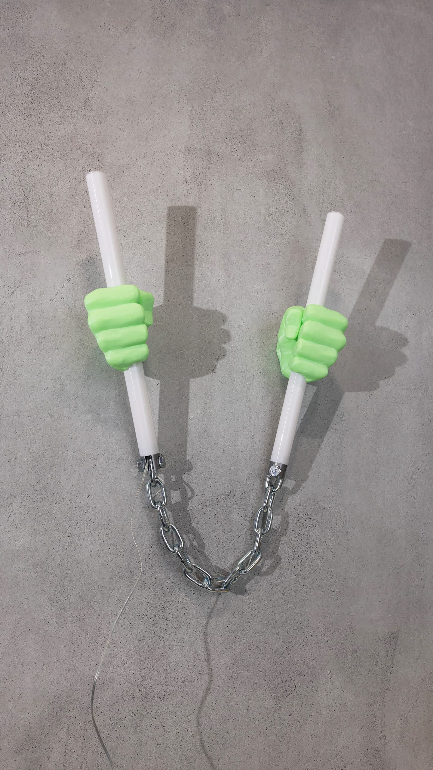oversized, 3d printed hands gripping two light tubes [cut from surplus material left over from large jobs], connected with chunky metal chain + attached with metal bolts for an extra industrial edge.