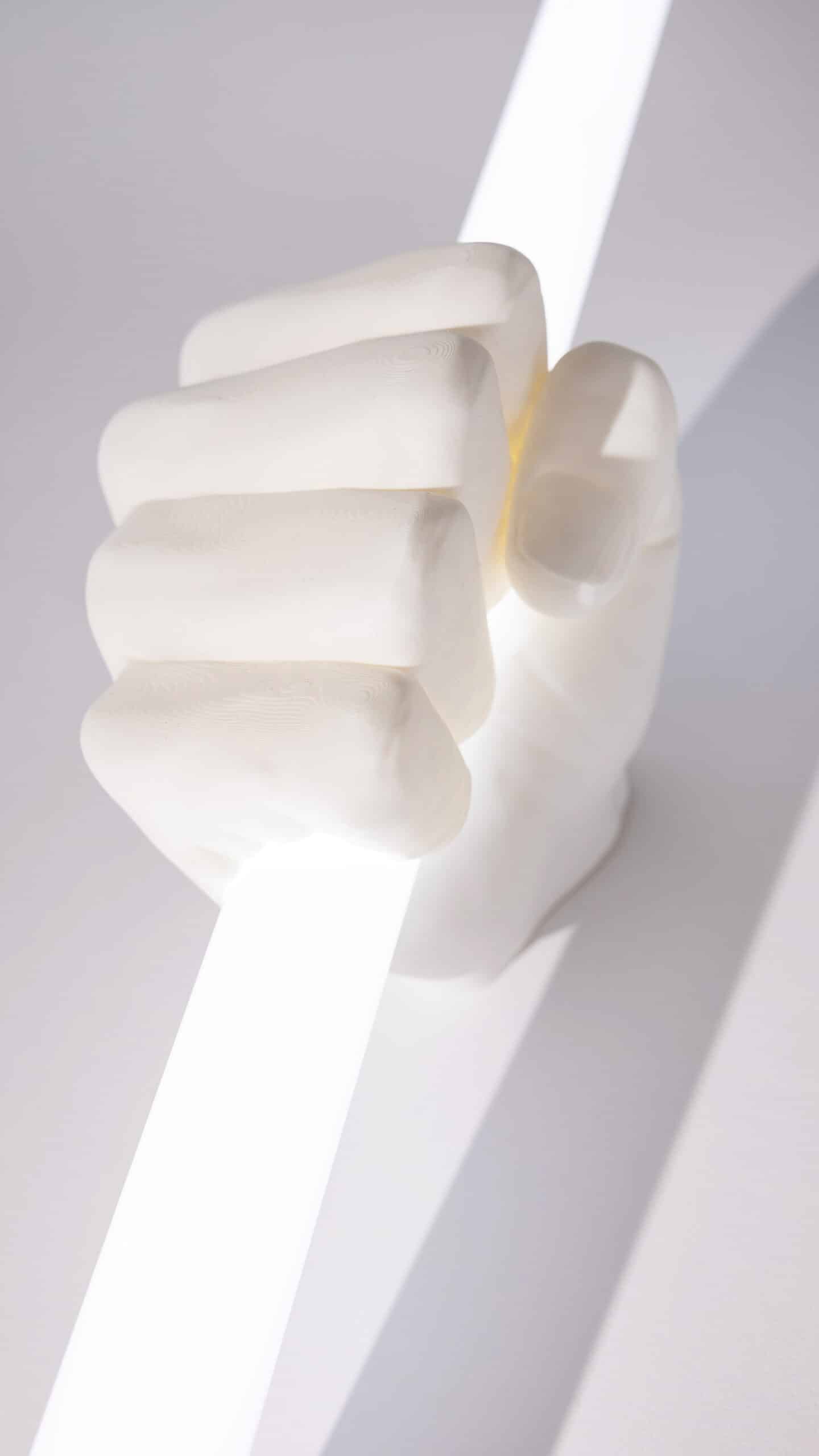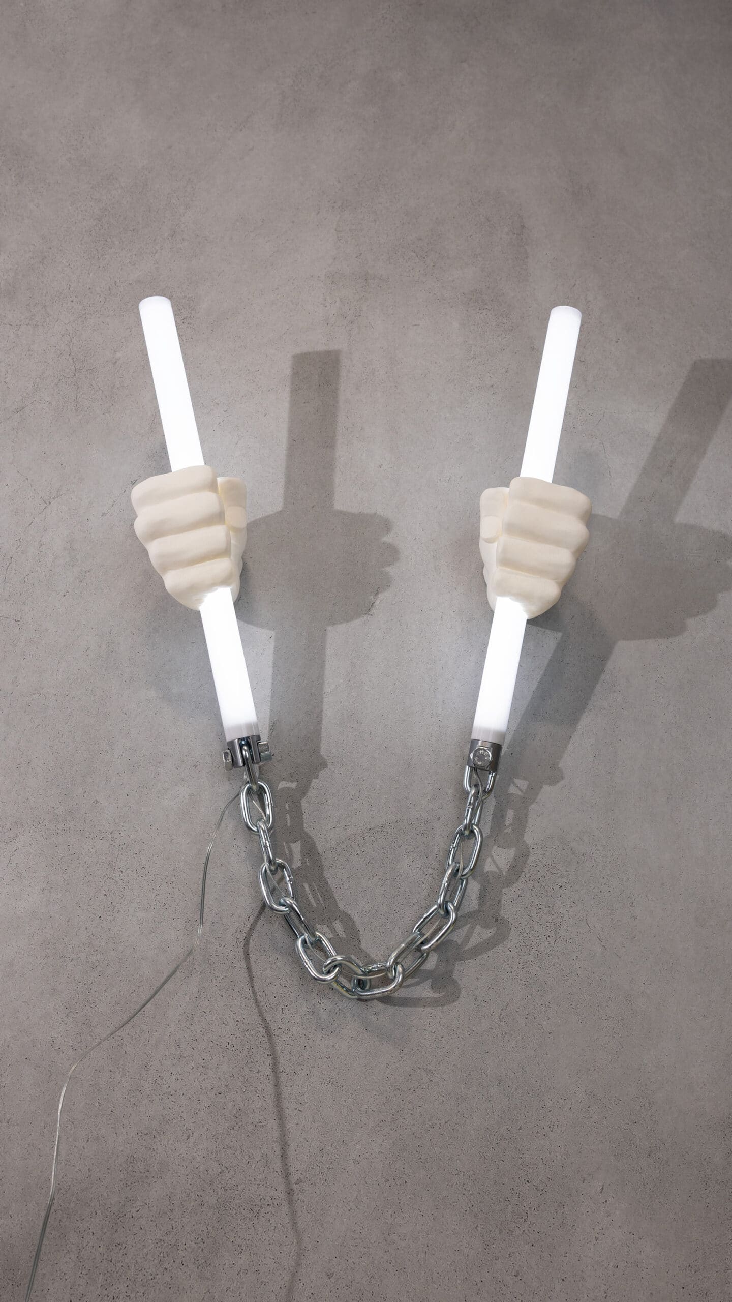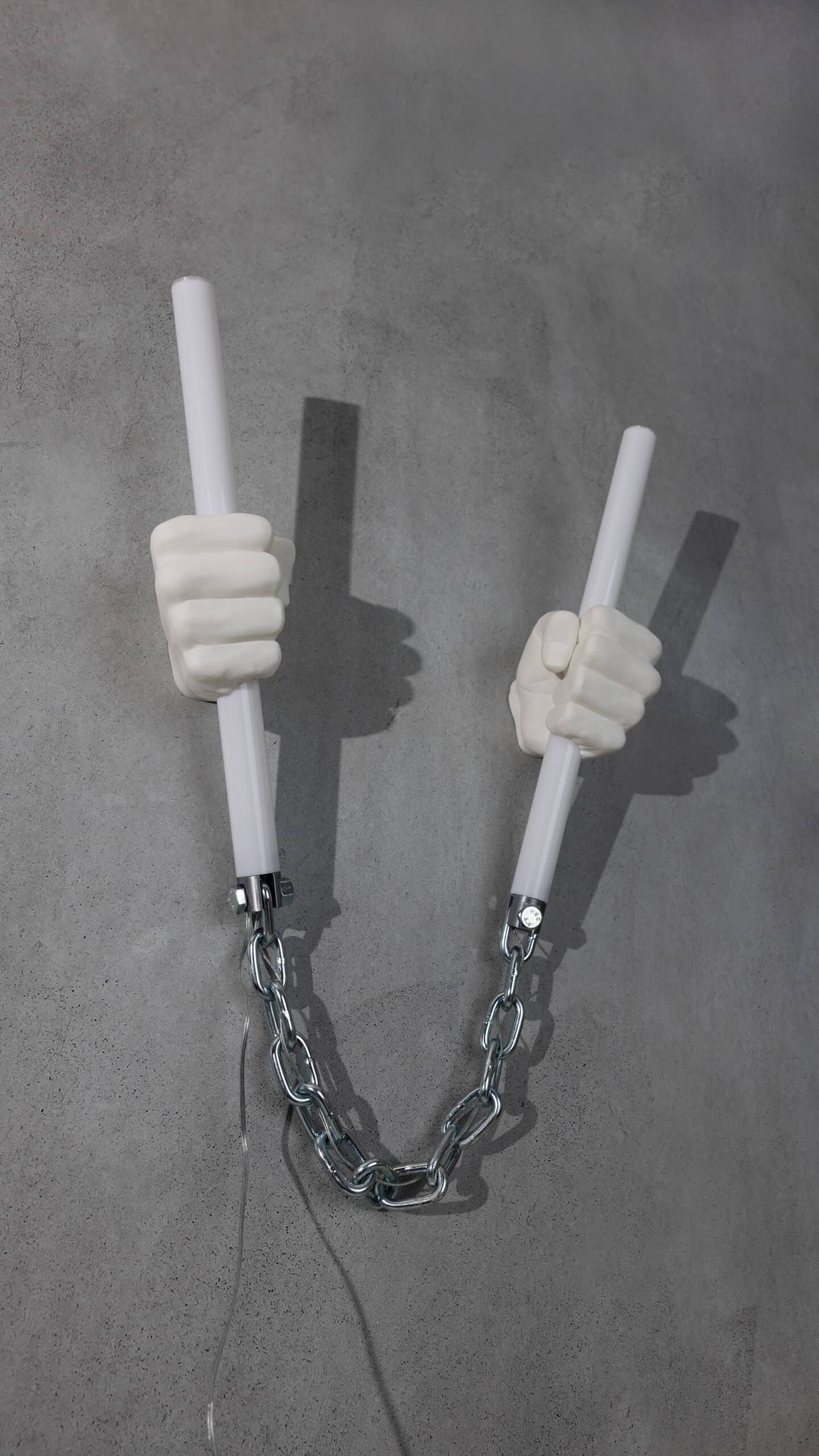 oversized, 3d printed hands gripping two light tubes [cut from surplus material left over from large jobs], connected with chunky metal chain + attached with metal bolts for an extra industrial edge.