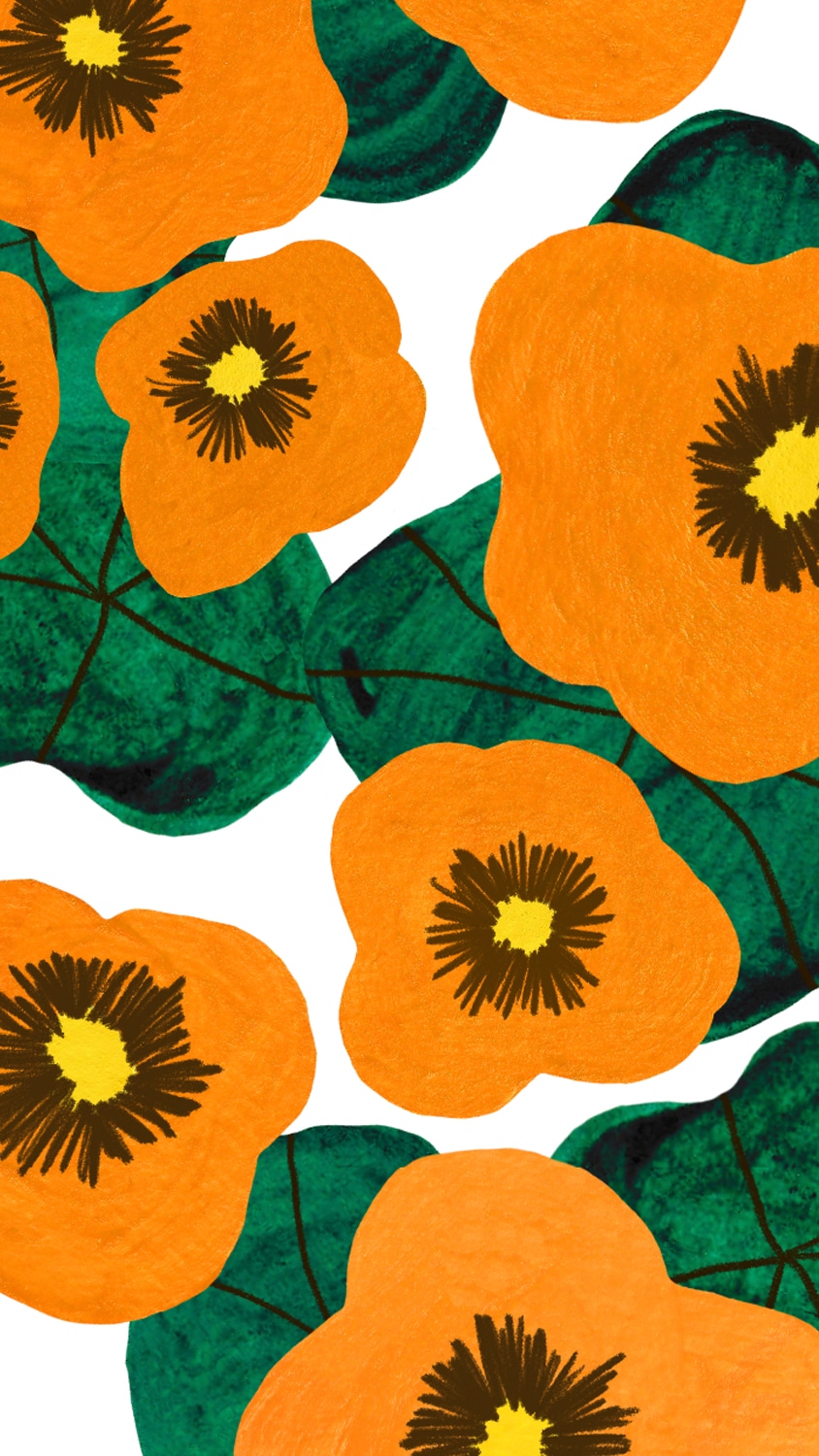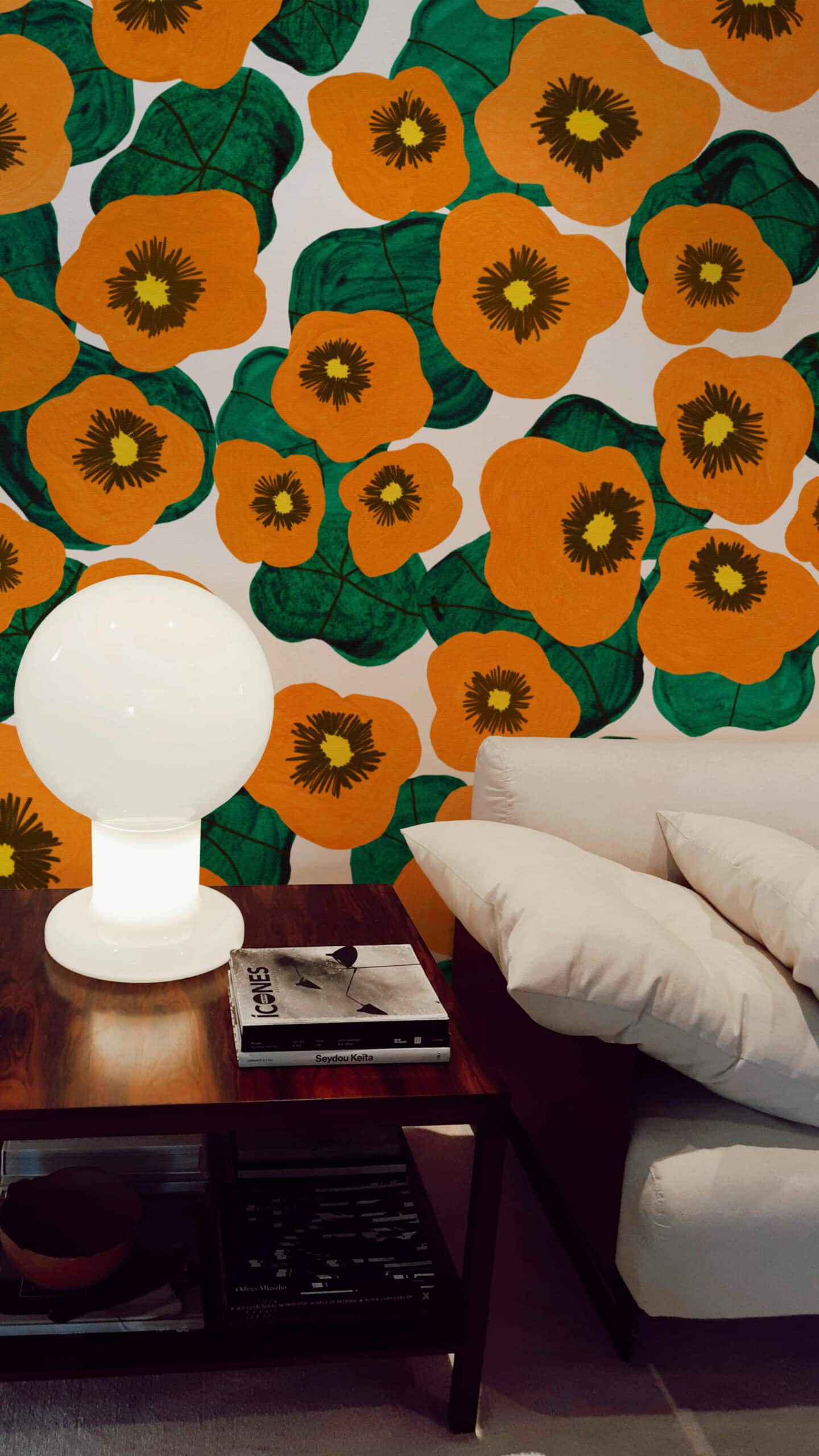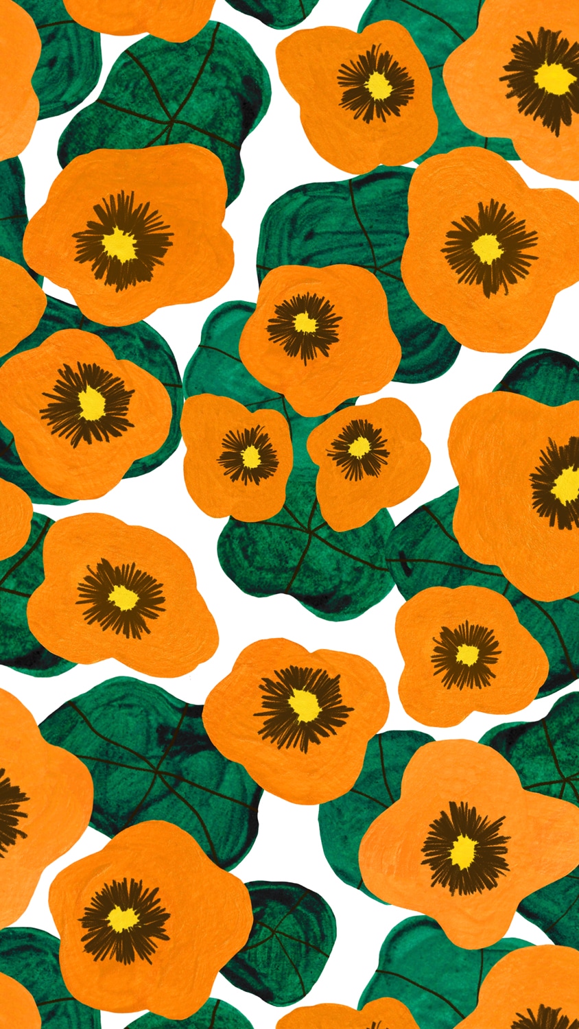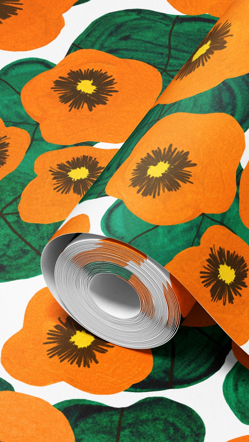 with oversized orange nasturtiums + lush green leaves ‘petal’ has retro-modern energy, transforming any room into a gallery of colour + energy.